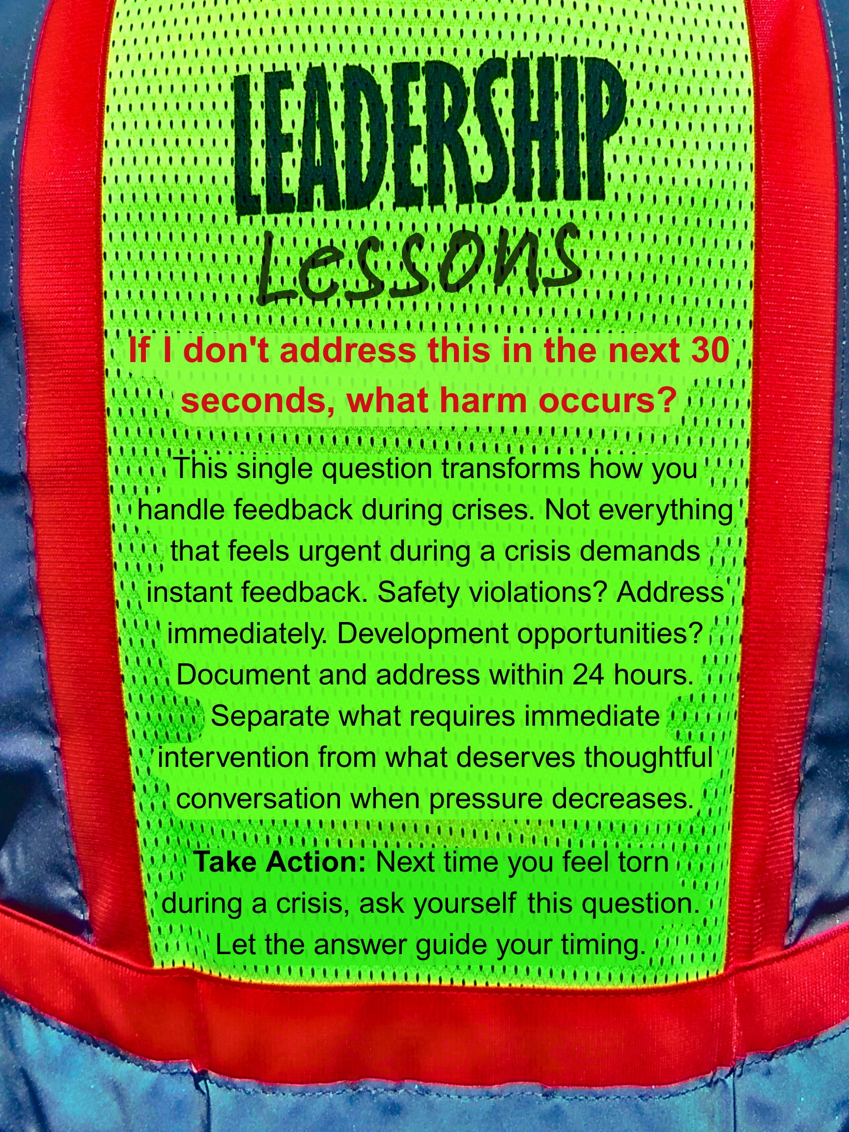 This single question transforms how you handle feedback during crises. Not everything that feels urgent during a crisis demands instant feedback. Safety violations? Address immediately. Development opportunities? Document and address within 24 hours. Separate what requires immediate intervention from what deserves thoughtful conversation when pressure decreases.