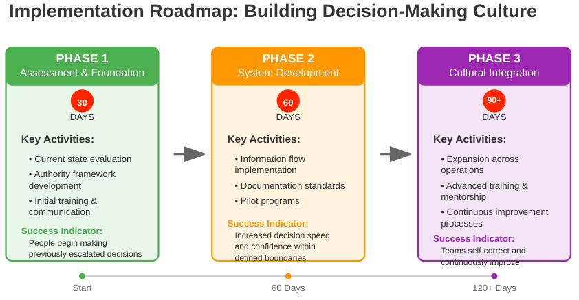 Establish Decision Learning Reviews: Schedule monthly 30-minute team sessions discussing decision effectiveness. Focus on system improvement, not individual performance evaluation.