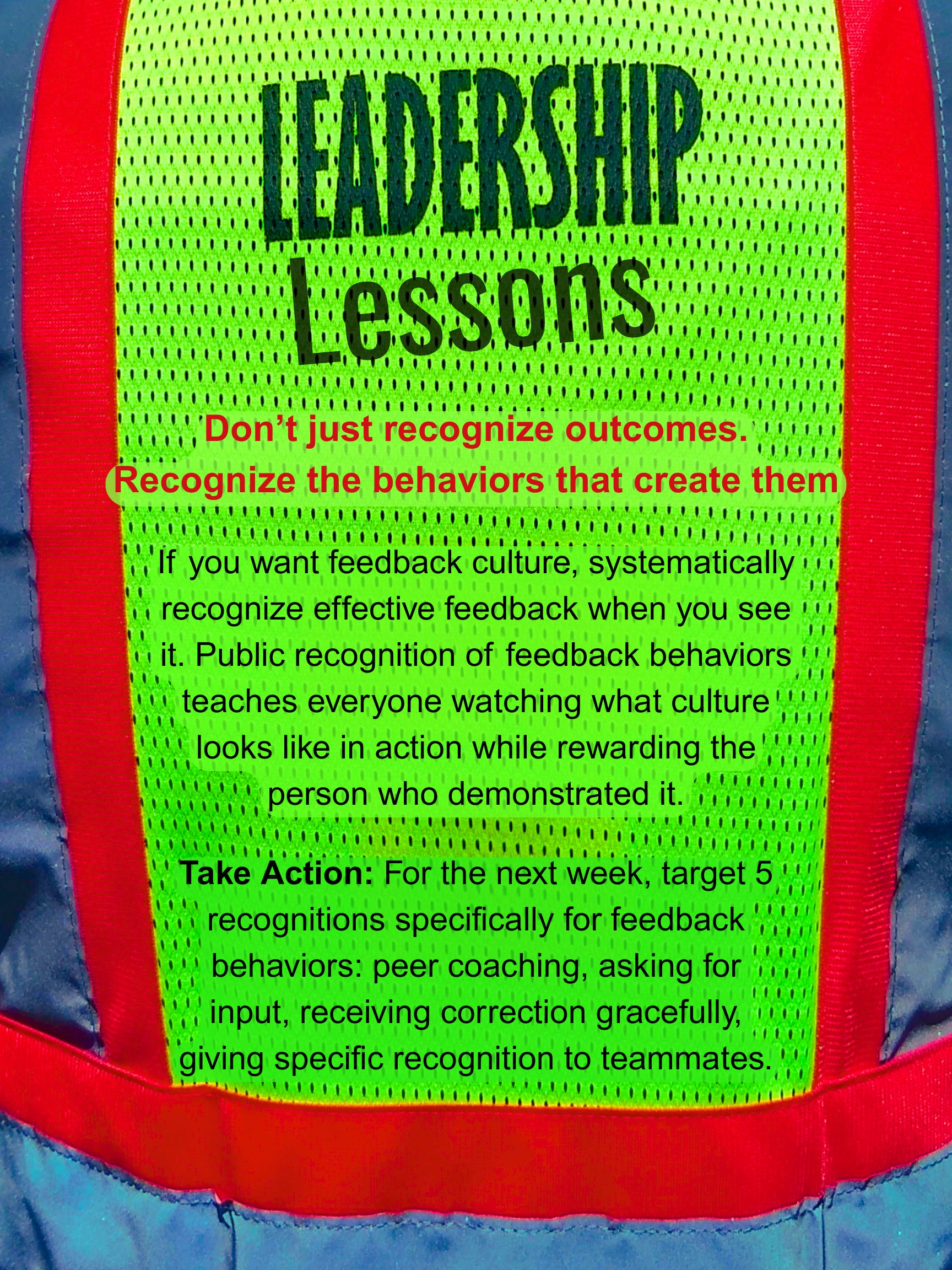 Take Action: For the next week, target 5 recognitions specifically for feedback behaviors: peer coaching, asking for input, receiving correction gracefully, giving specific recognition to teammates.