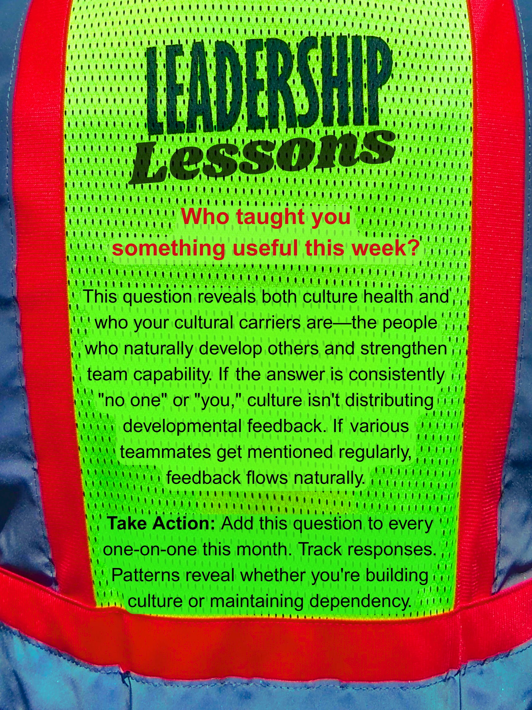 This question reveals both culture health and who your cultural carriers are—the people who naturally develop others and strengthen team capability. If the answer is consistently “no one” or “you,” culture isn’t distributing developmental feedback. If various teammates get mentioned regularly, feedback flows naturally.