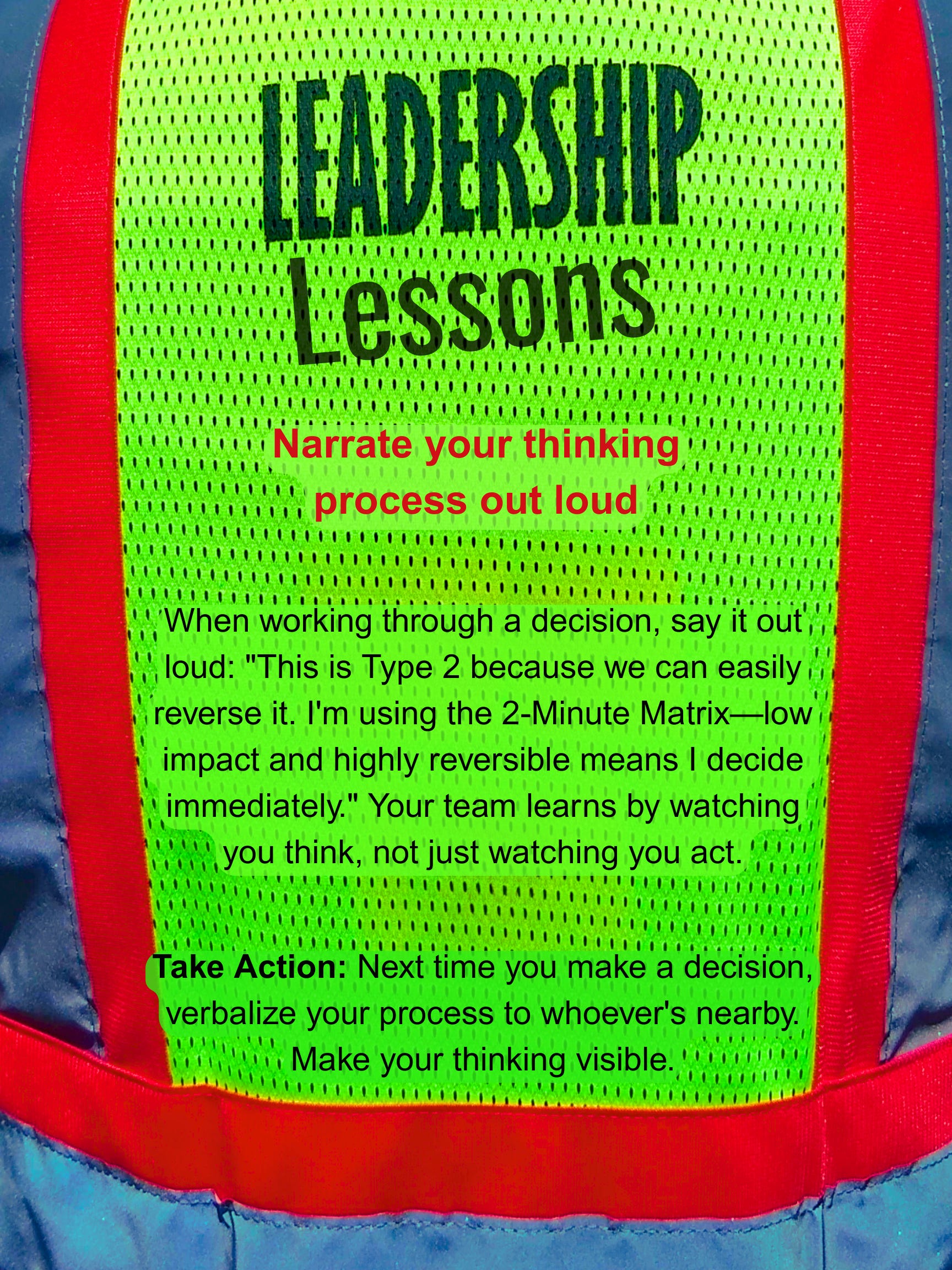 When working through a decision, say it out loud: “This is Type 2 because we can easily reverse it. I’m using the 2-Minute Matrix—low impact and highly reversible means I decide immediately.” Your team learns by watching you think, not just watching you act.