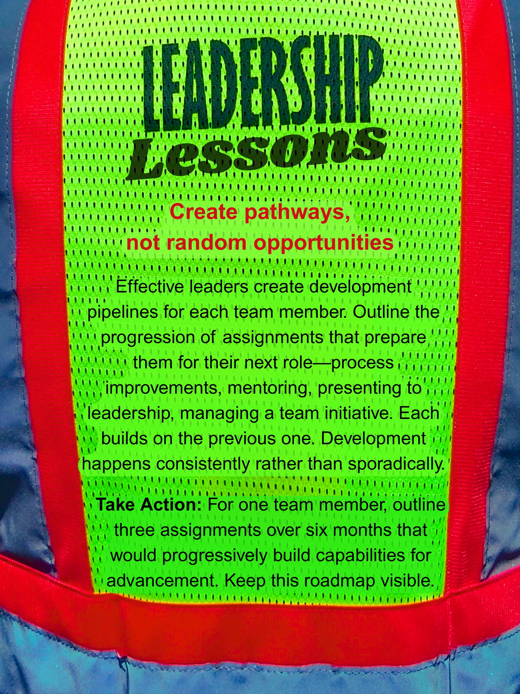 Take Action: For one high-potential team member, outline three assignments over six months that would progressively build capabilities for advancement. Keep this roadmap visible.