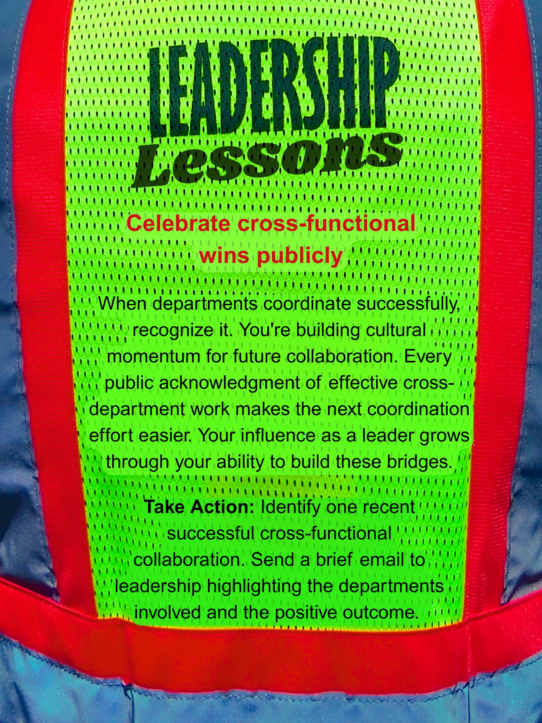 When departments coordinate successfully, recognize it. You’re building cultural momentum for future collaboration. Every public acknowledgment of effective cross-department work makes the next coordination effort easier. Your influence as a leader grows through your ability to build these bridges.