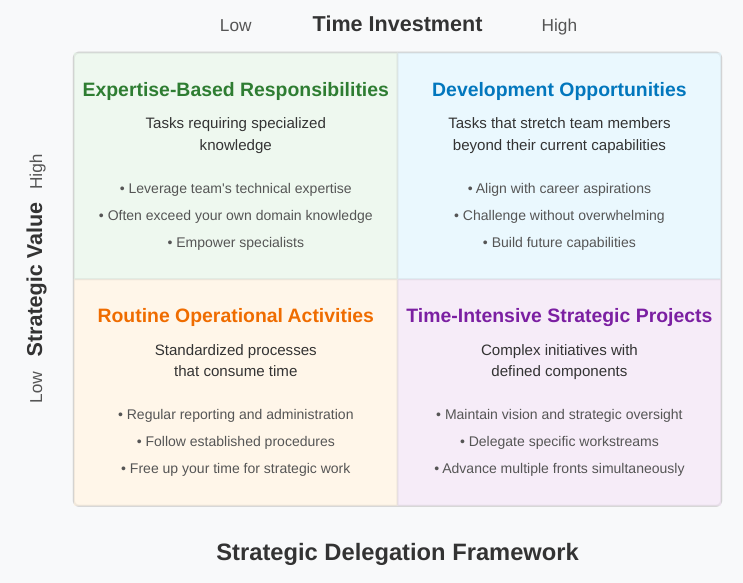 Through years of leadership experience, I've refined a framework that helps identify which responsibilities to delegate and which to retain. This framework organizes tasks into four distinct categories: